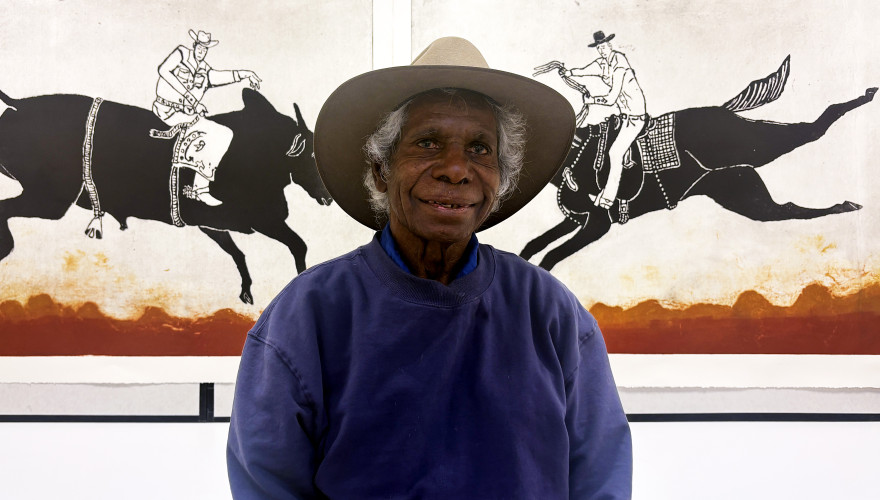 He began drawing as a child - inspired by Hollywood westerns - using a water tank as his first canvas. Aged 14, he became a stockman on the same station where his parents had worked for most of their lives without pay - an injustice which would later inspire Mervyn to lead a landmark $180 million class action against the Western Australian government on behalf of thousands of Aboriginal station workers denied their rightful wages - with settlement successfully reached in 2023.